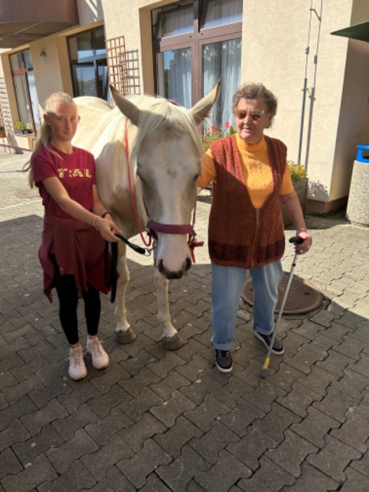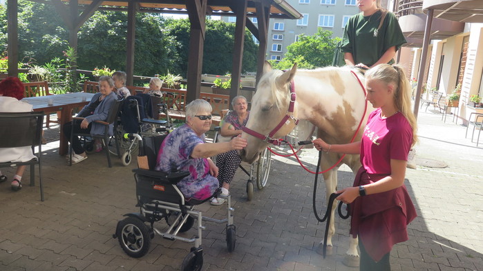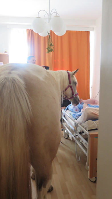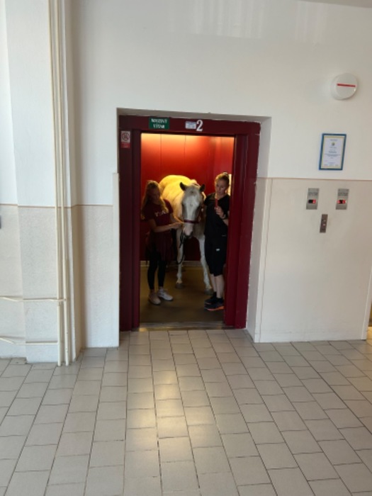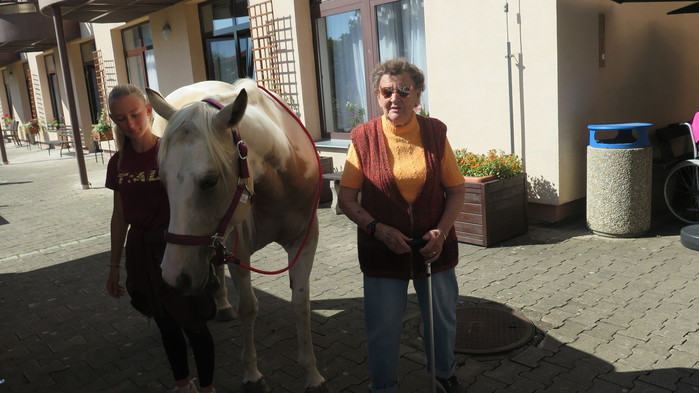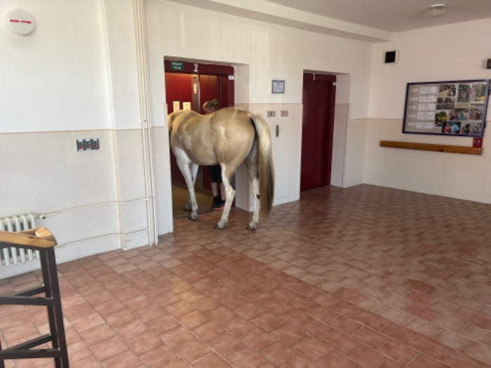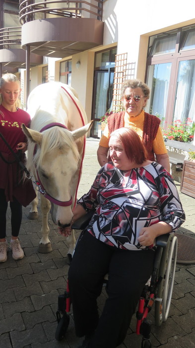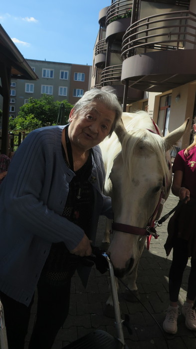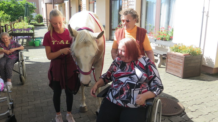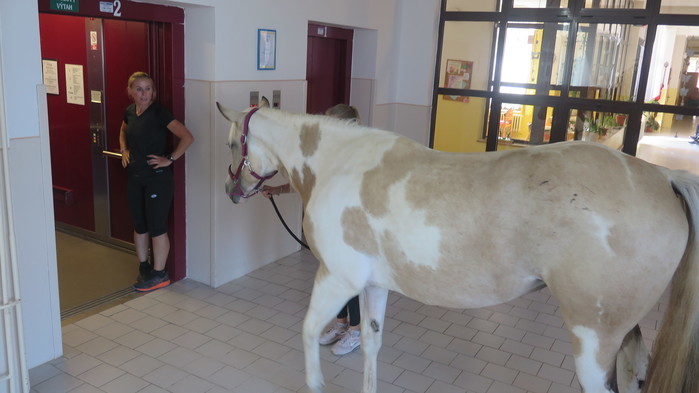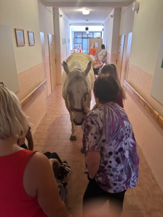 Důkazem „bezbariérovosti“ našeho Domova je i každoroční návštěva klisny Bely na pokojích našich klientů. Ani cesta výtahem pro ni není překážkou. Děkujeme paní Sedlákové i Bele za odvahu!