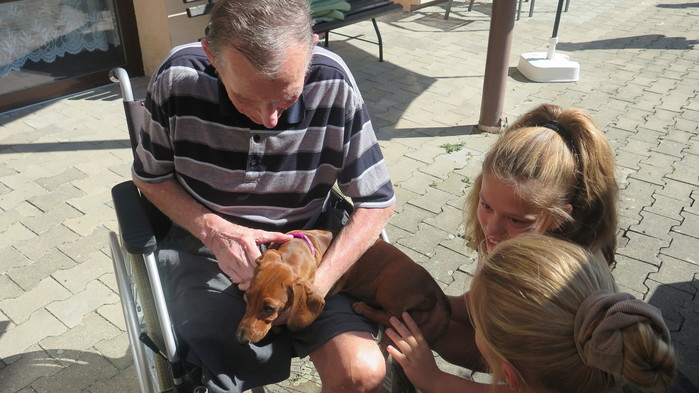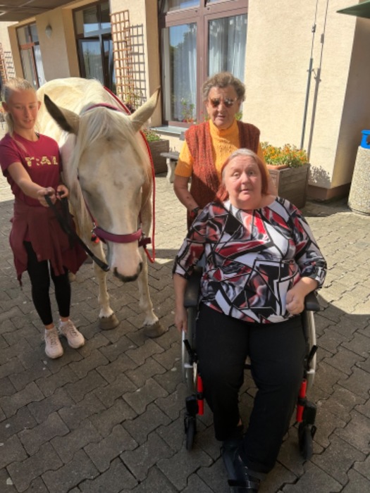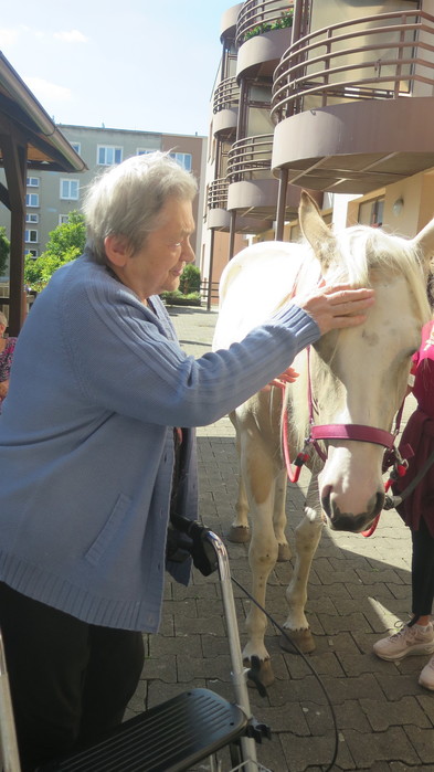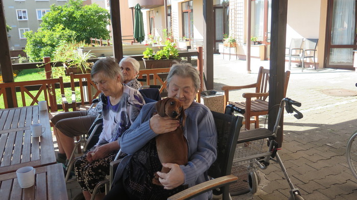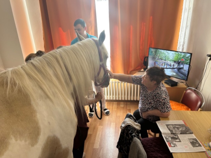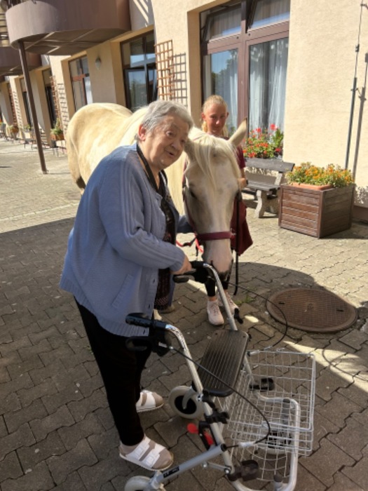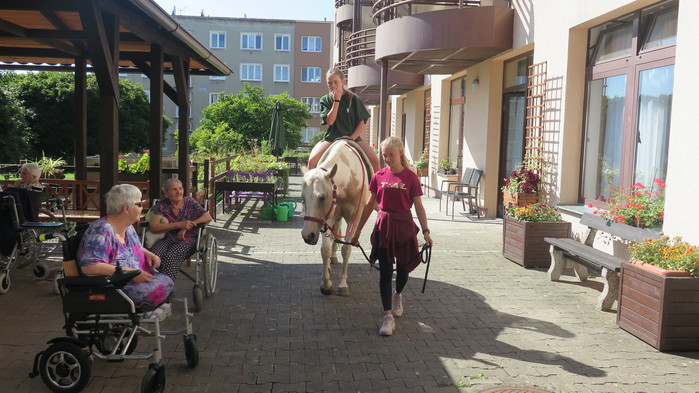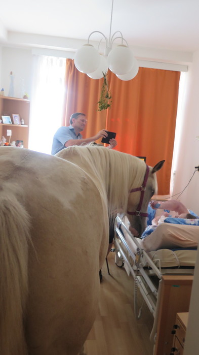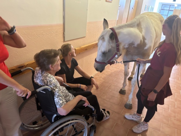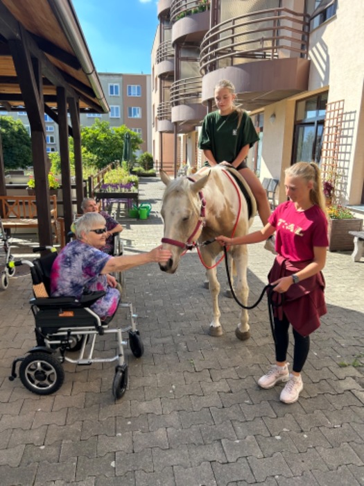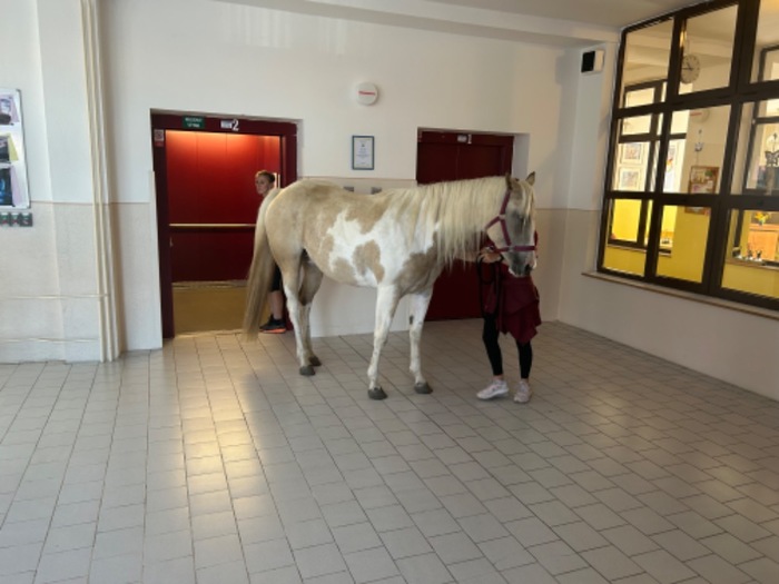 Důkazem „bezbariérovosti“ našeho Domova je i každoroční návštěva klisny Bely na pokojích našich klientů. Ani cesta výtahem pro ni není překážkou. Děkujeme paní Sedlákové i Bele za odvahu!