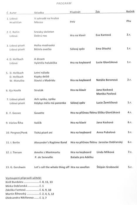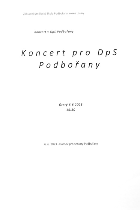 V letošním roce proběhl v našem Domově již druhý koncert žáků a pedagogů Základní umělecké školy z Podbořan. Hudební vystoupení potěšilo nejen klienty Domova ale také přítomné rodiče a blízké vystupujících žáků. Za příjemné hudební odpoledne patří poděkování žákům a pedagogům ZUŠ Podbořany. Těšíme se na další spolupráci.